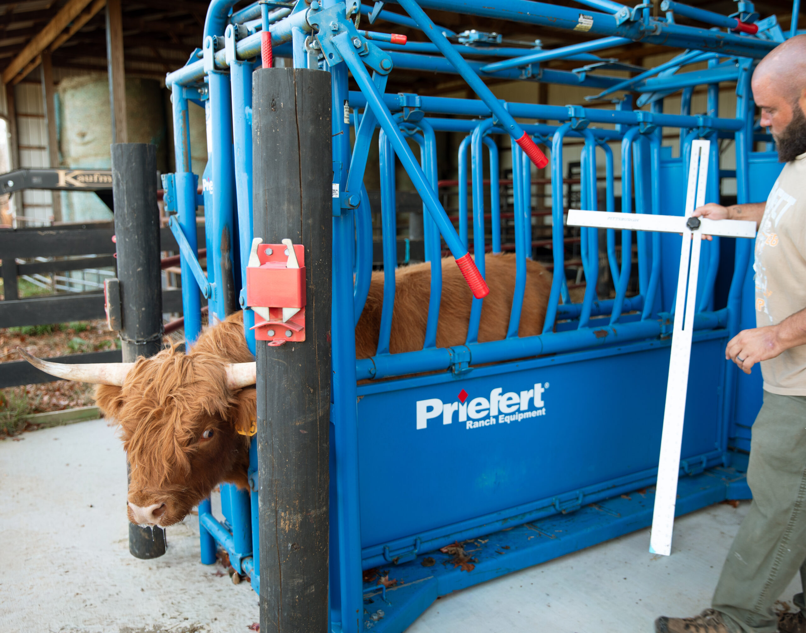 Safety always comes first. Restrain the animal in a stanchion, chute, or head gate, as shown in the photo. This setup keeps both you and the animal safe while ensuring the cow stands still enough for measurement.
