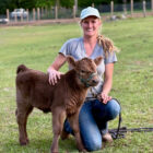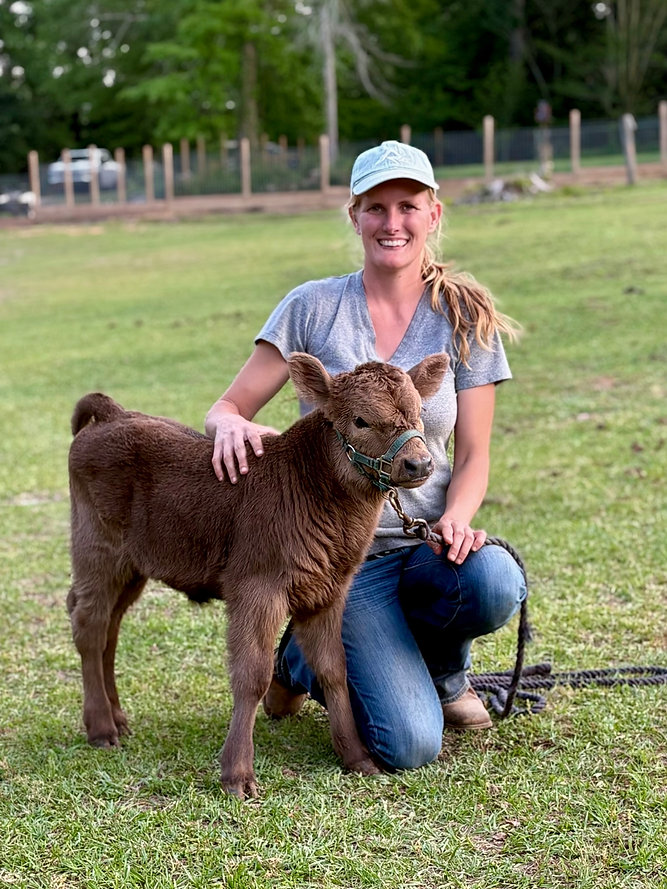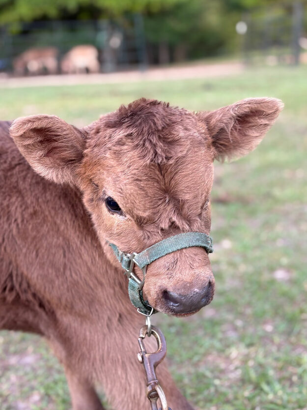 Amaretto is a mini highland x lowline heifer calf. Both her parents are under 42” at the hip. She is a month old and drinking two bottles a day. She is learning to walk on a halter and lead. Amaretto is polled (no horns).