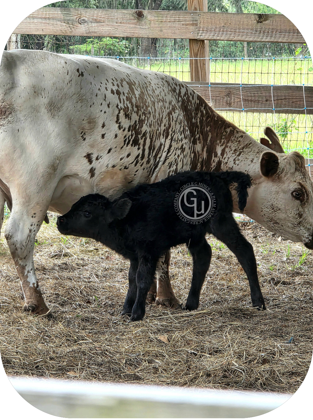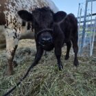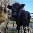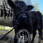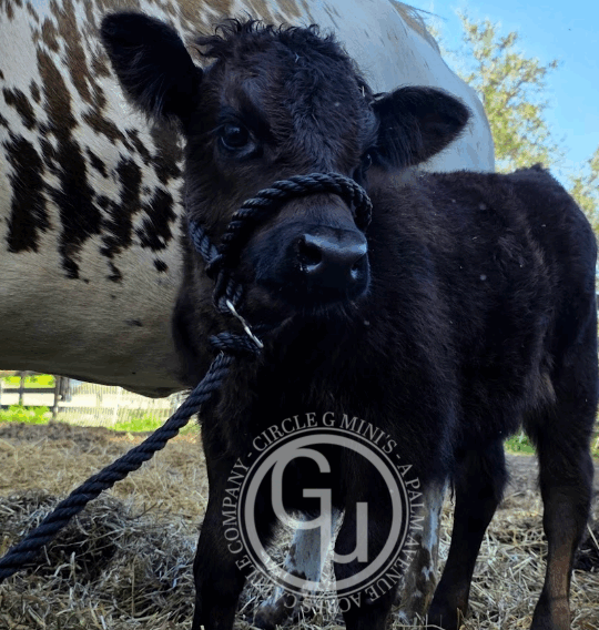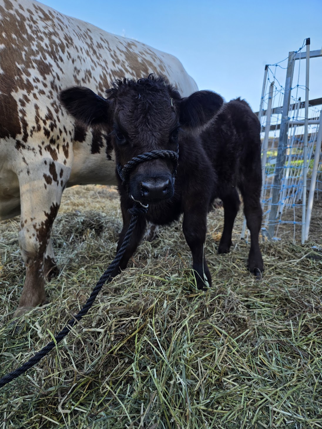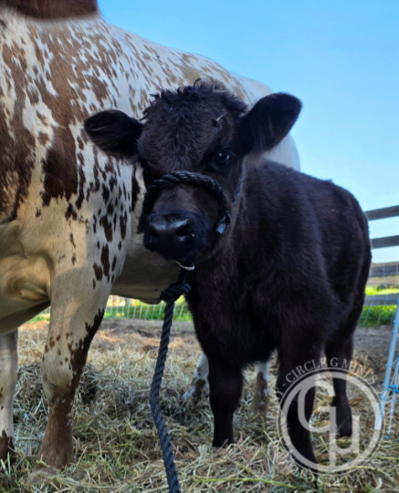 CLG Corbin is a black, horned, miniature Highland/Speckle Park bull calf* with a calm, observant nature. He’s chondro-negative and E/E for black, carrying the solid frame and plush coat expected from this pairing. Though naturally shy, Corbin is halter-started and yields well to pressure, responding calmly once he understands what’s being asked. He is growing into a handsome, even-tempered boy with a mild and thoughtful disposition.