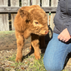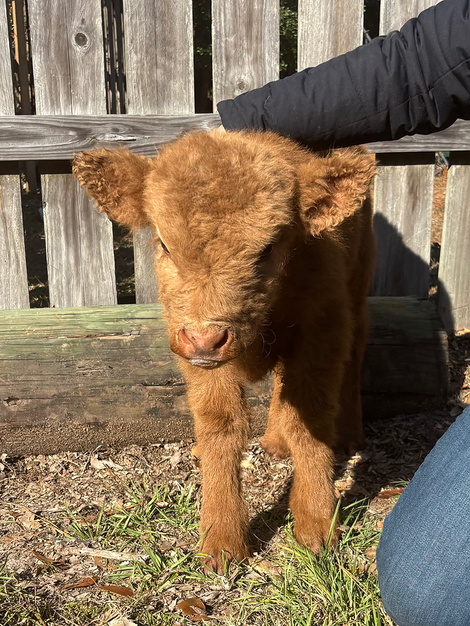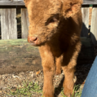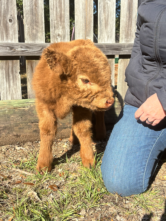Little Drummer Boy (DB for short) is a very handsome mini highland bull calf. Both his parents are under 42” at the hip. DB currently has bright blue eyes and some of the curliest ear hair we have ever seen! He is quite the looker.