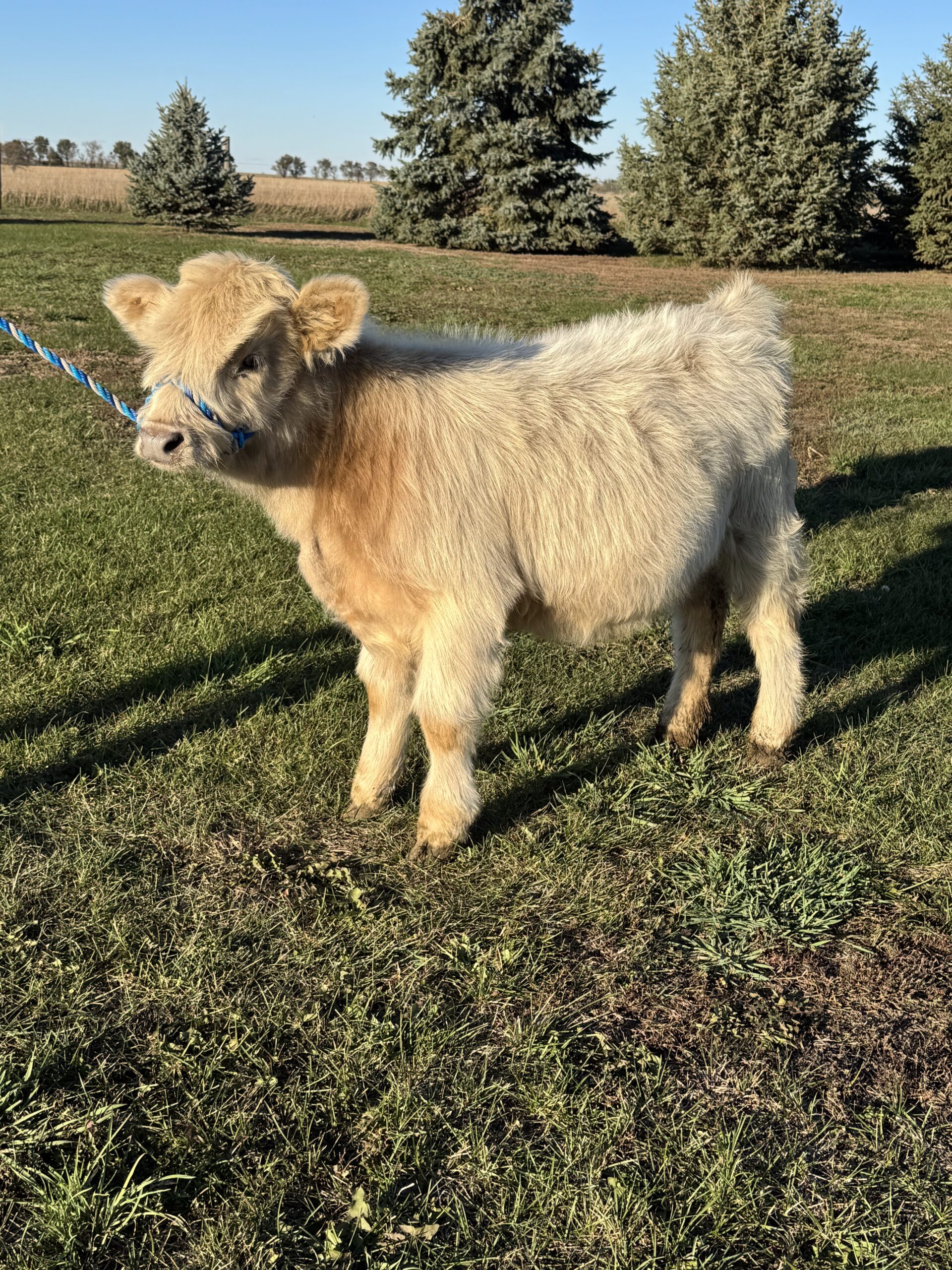 Charlotte is a beautiful 6-month-old silver highland heifer. She is out of a silver bull and a dun cow. Charlotte is halter-broke and easy-going. She loves attention and is very docile. Charlotte is definitely a great quality heifer that will produce some great calves. If you would like to talk more about Charlotte give me a call at 402-641-9621.