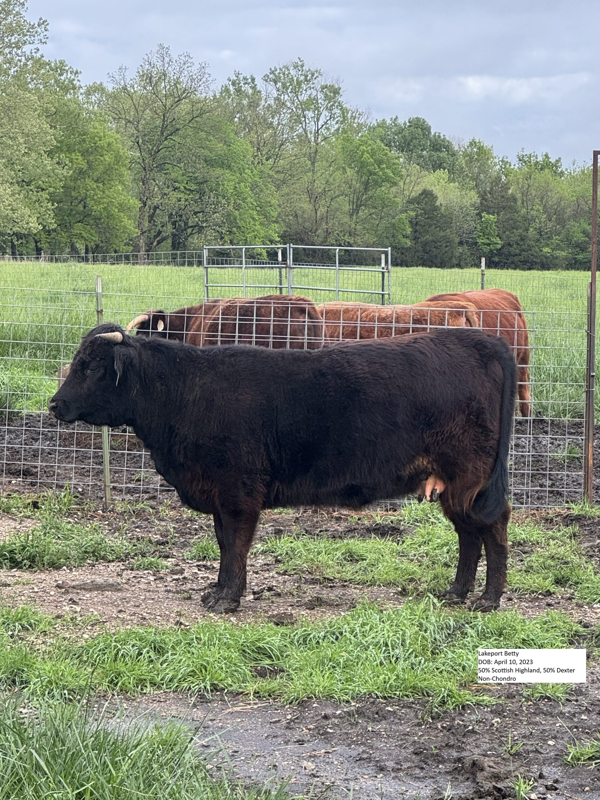 - Dam: Lakeport Betty – 50% Scottish Highland, 50% Dexter, Non-Chondro, Pictured