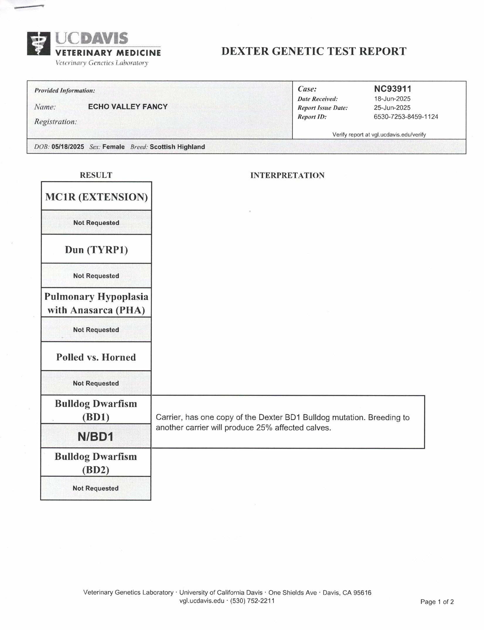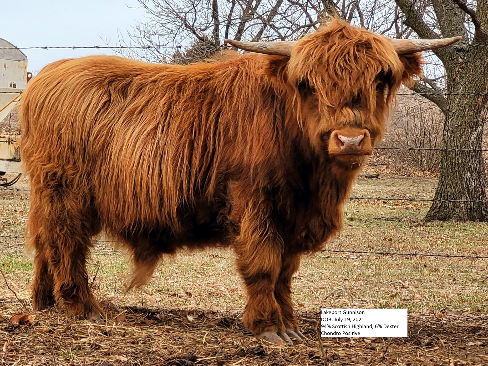 - Sire: Lakeport Gunnison – 94% Scottish Highland, 6% Dexter, Chondro Positive, Pictured