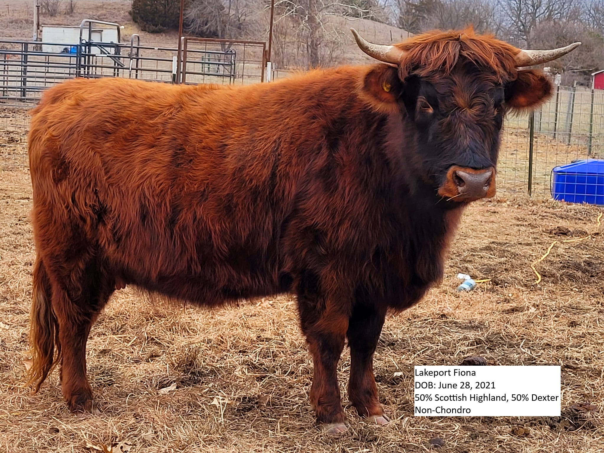 - Dam: Lakeport Fiona – 50% Scottish Highland, 50% Dexter, Non-Chondro, Pictured