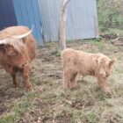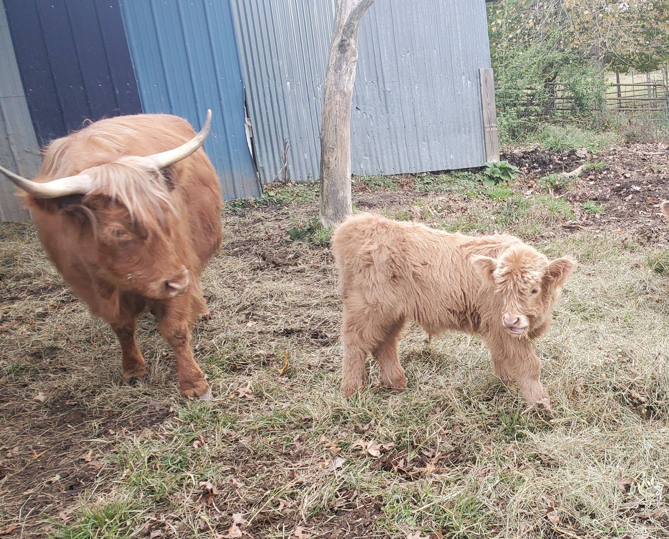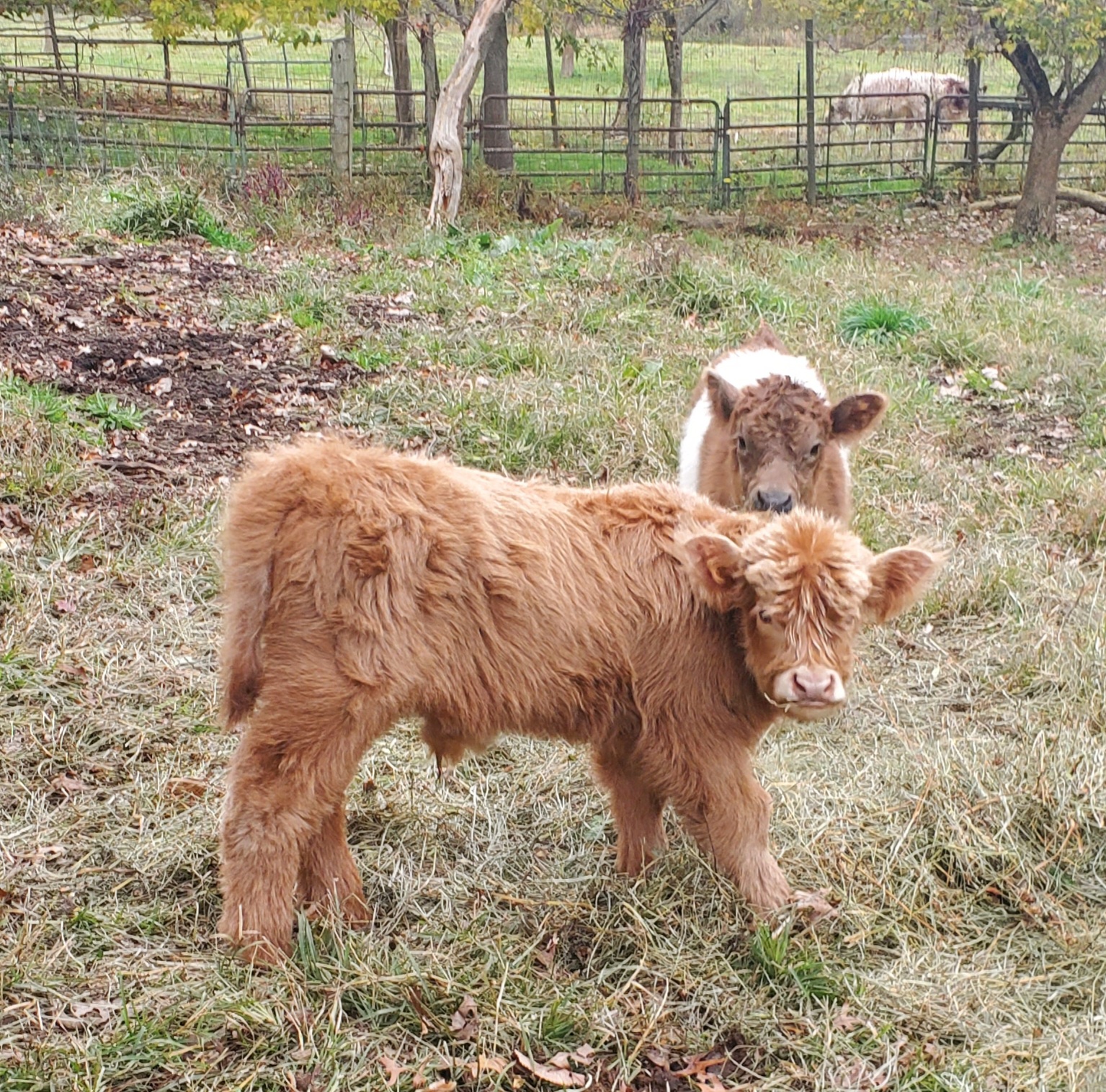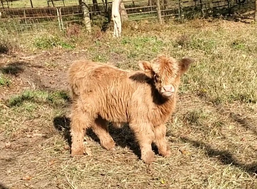 This little guy is adorable and has hair for days. Anna, his dam is 43 1/2 inches tall sire is 44 inches (his grand sire, Duncan of Ravenwood, stands 39 inches tall at 10 years old- pure highland, non chondro) . Ajax is yellow and could carry the same frosted wild type gene that his mother has. His sire is Harry our silver Highland bull (Harry is not polled he is dehorned.) He is 2 months old and could be under your tree at Christmas, or we can hold him till January. A deposit will hold him till he is weaned. If Ajax goes as a steer his price will be reduced. We can help you arrange shipping to most states nationwide and have a shipper we work with.