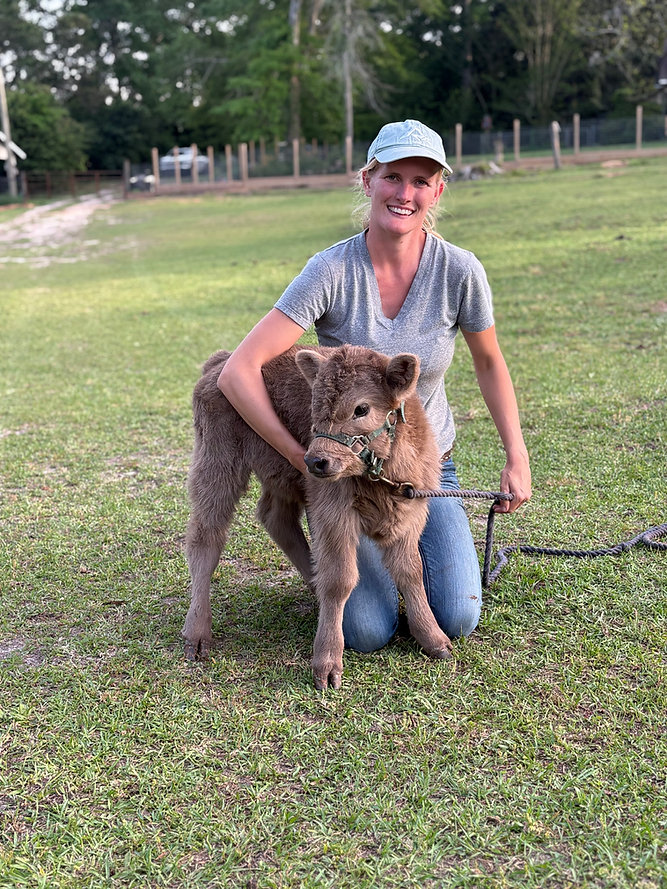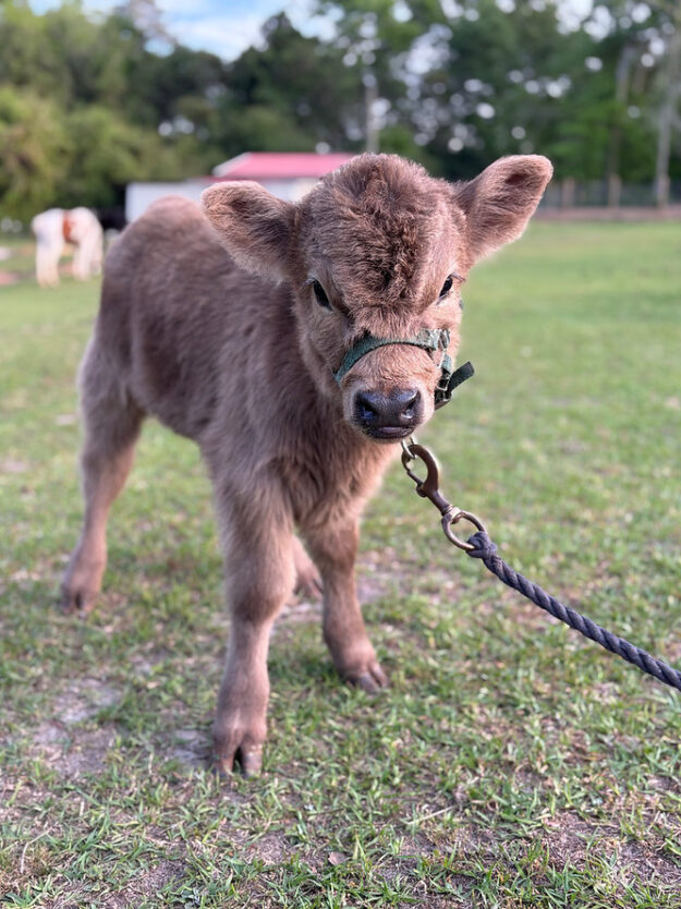 Toffee is a mini highland x lowline heifer calf. Both her parents are under 42” at the hip. She is five weeks old (04/13) and drinking two bottles a day. She is learning to walk on a halter and lead. Toffee is polled (no horns).
