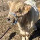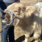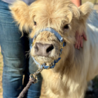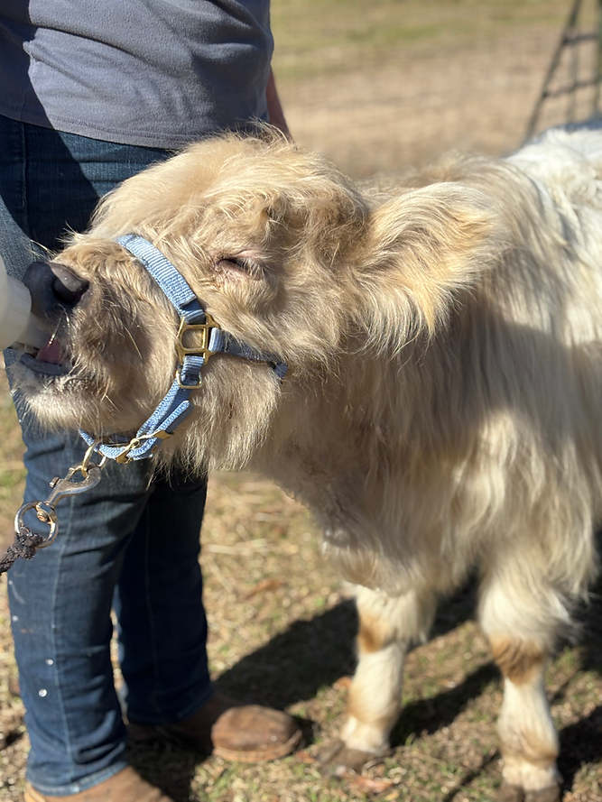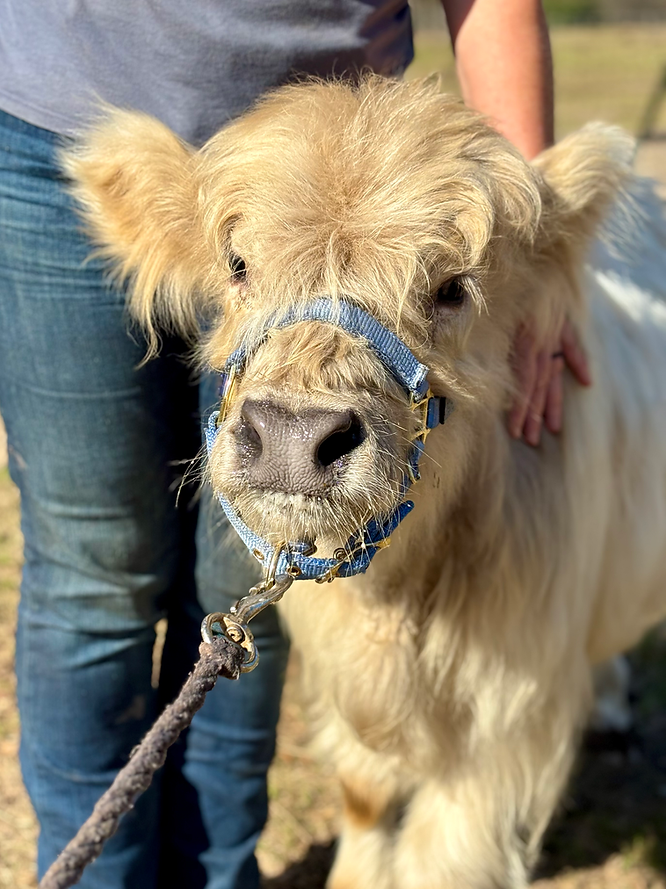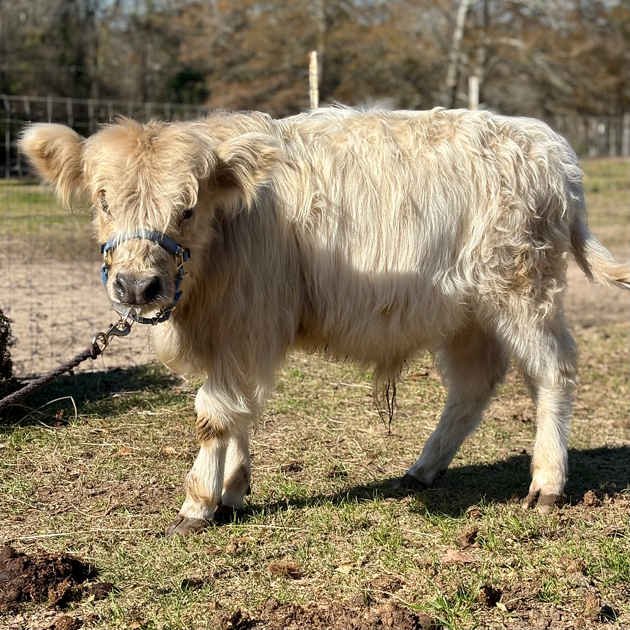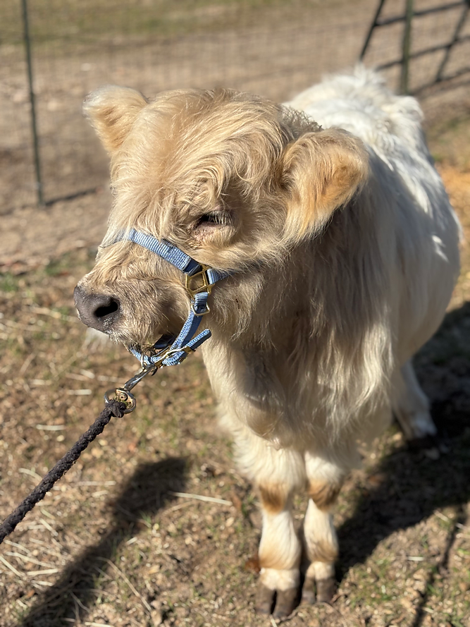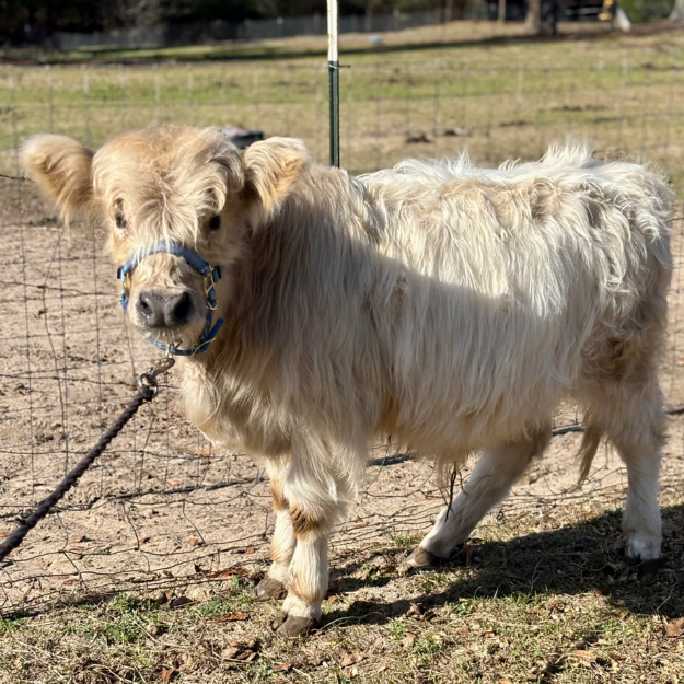 Wells is a HiBelt (highland x belted Galloway) bull calf. He is 7.5 months old (as of December 26) and will be a smaller mid-size mini. He currently measures 32” at the hip. He is a STOUT guy. Wells is naturally polled (no horns). He is on one bottle a day of colored water (no one tell him!) but can be weaned at any time. He is eating hay and grain..