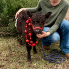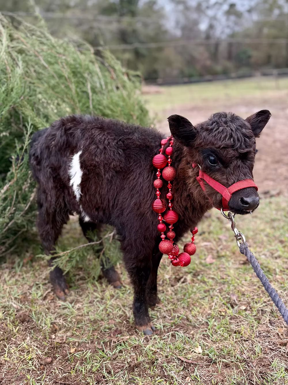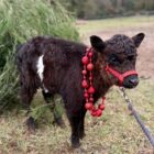 Meet Zara (heifer calf). She is 6 weeks old (as of December 04). Zara is a little heftier and stands a whole 24”. She is a mini belted Galloway (belted Galloway x micro mini Dexter). Her dad stands a whole 34” tall. Zara’s mom is a small mid-size standing 44”.